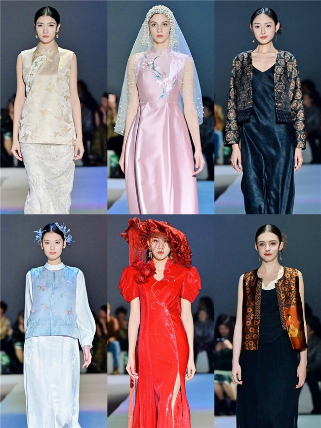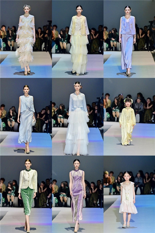 随着“渐染春息”章节的展开,色彩开始流动,层次逐渐丰富,如同冰层下悄然涌动的春水。最终,“满庭芳华”将轻盈的花罗、飘逸的宋锦化为衣袂翩翩的裙装。“服装的终极目的,是服务于人的情绪与状态,助力穿着者实现内在的舒展与绽放。”